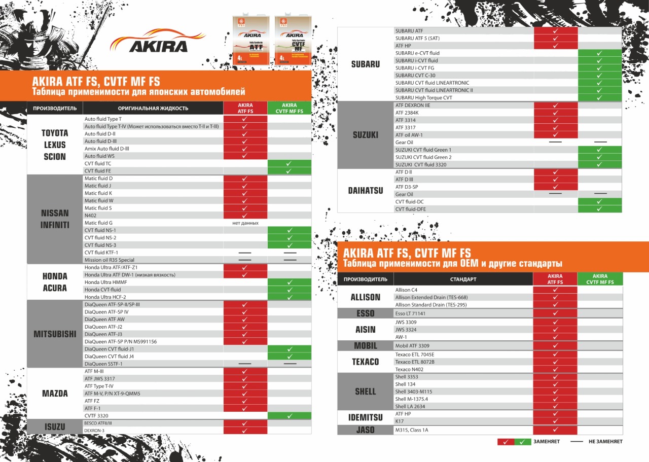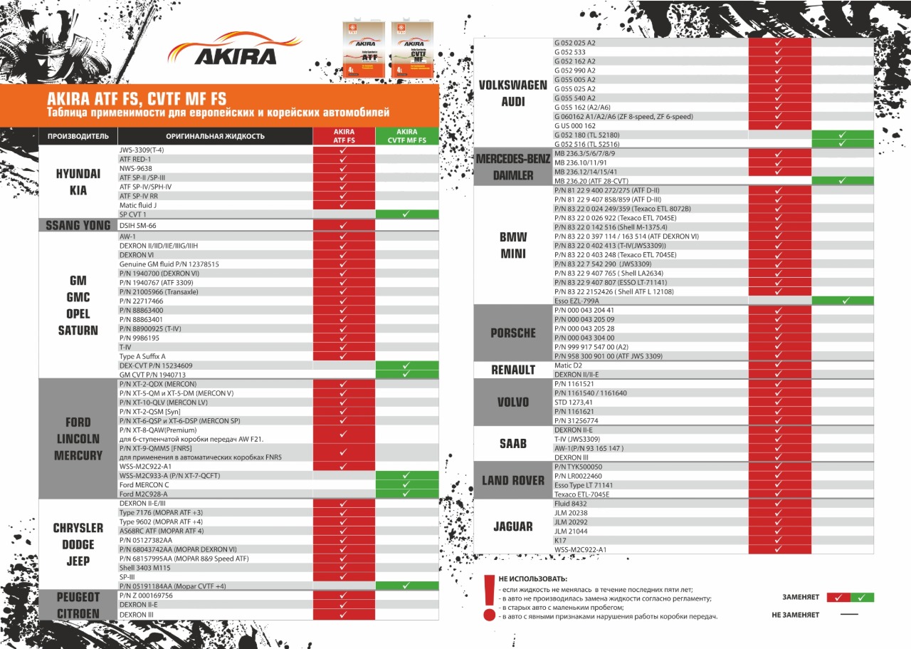 Таблица применимости трансмиссионных жидкостей AKIRA